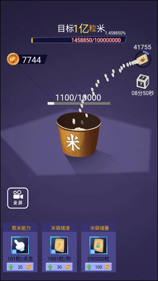 抖音数1亿粒米小游戏是一款休闲解压游戏,这款游戏玩法非常简单,只需要点击屏幕就可以数大米,但是由于1亿粒米的目标太大,因此想要更快的将1亿粒米数完,还需要玩家使用金币来升级数米能力、米袋储速、米袋储量来加速你数米的速度。同时游戏除了点击屏幕可以获得大米之外,游戏内还拥有一个米袋功能,米袋会自动获得大米,并且获得大米的数量也与米袋的等级有关,等级越高,每秒所获得大米的数量也就越多。