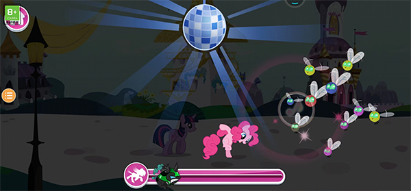 3、小游戏:与紫悦一起玩“弹弹球”,跟云宝玩“魔法之翼”,还可以和任何小马在“舞林争霸”中尬舞!