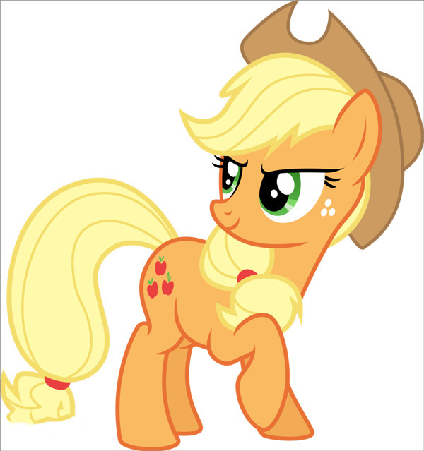 橙黄色身体,金色鬃毛,翡翠绿眼睛,头戴牛仔帽小马。可爱标志为三颗苹果,是小马驹系列第一代就有的元老小马。