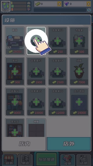 在这里选择你要购买或建造的设施,根据指引先购买一张会客桌吧!