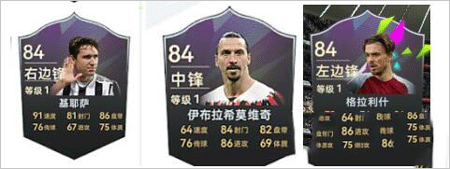 第7天登录游戏,终于等到一张黑卡了,开头提到过等级1级的黑卡球员的能力值范围是83-93,三选一的球员,伊布的话身高+射门,头球任务和禁区内搓射都很好用,就是速度和体质略低;格拉利什进攻和体质相对较低,基耶萨速度到91还是很快的,但对比进攻和传球就稍微低点