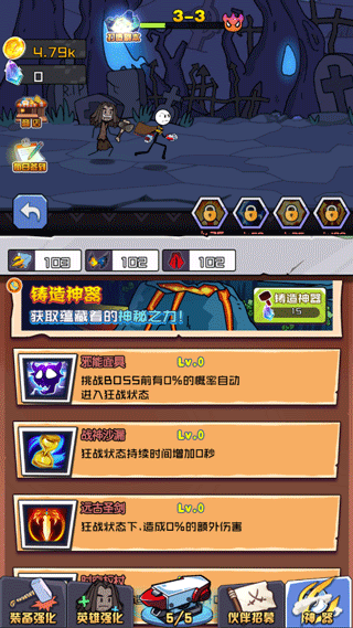 5、点击“神器”,使用砖石来打造更强大的神器,秒杀大boss。