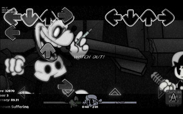 米奇笑的比较诡异,上下动过一个循环后闪一下脸。变身后,与之前的happy阶段那个米老鼠模样差不多。唱的过程中会闪出一张米奇融化的脸,bf可能会变成全身黑。脸部变成满脸番茄酱的米老鼠不断抖动。