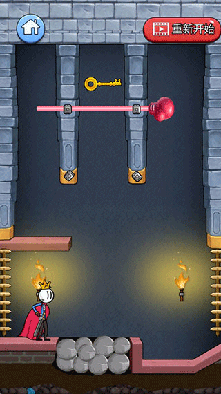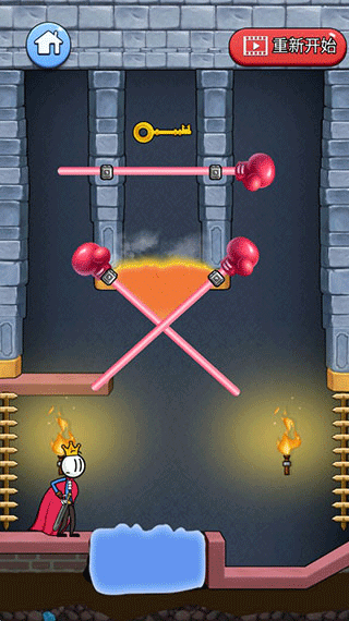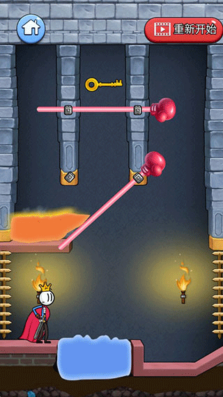 3、掉到旁边后,我们再移动右边的棍子,让岩浆可以成功掉入水里,最后,再把上面的棍子拿掉,这样火柴人就可以成功拿到钥匙。