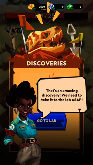 3、化身成为古生物学家,系统中拥有几种不同的恐龙在等待玩家发现,你要一步步的改善自己的操作发现更多的化石,只需要通过点击就能将土块挖开,但是需要注意角色的精力是有限的,无法将画面中所有的土块全部挖开,你要选择最有可能出现出现化石的土块。