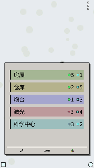 该图中,第一个姑且称它中枢,所有的建筑都必须点击它之后再点击屏幕下方的+才能选择建造,图中的这个面板就是点击+后弹出的,