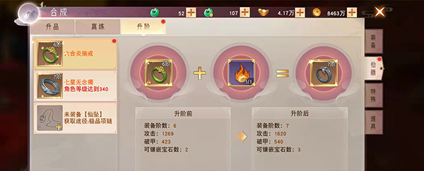 而升阶之后装备就是六阶装备,攻击力是一千二百六十九,破甲指数是四百二十三,可以镶嵌的宝石的数量还是两颗,玩家拥有仙戒和升阶灵火之后,系统提亮最下面的升阶两个字,玩家只要点击亮了的升阶就可以成功升阶了,战力提升了4217;