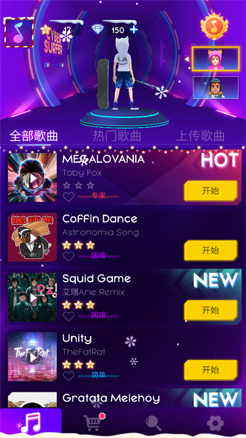 5、然后返回首页,我们可以看到有全部歌曲、热门歌曲和上传歌曲,玩家可以任意选择自己想要的歌曲,点击开始即可游玩;