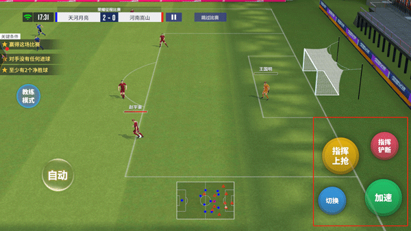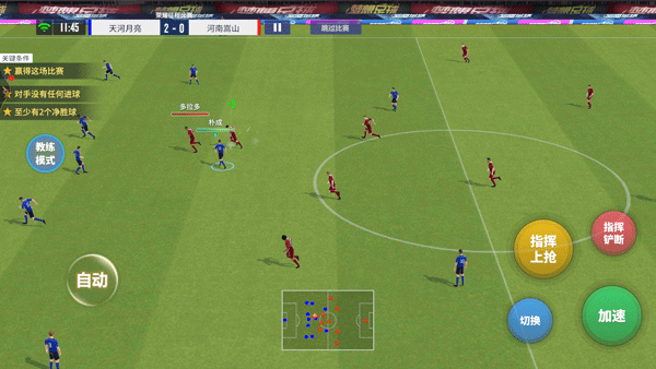 2、游戏过程中,并不是所有的玩家都会时刻处于顺风状态,有的时候我们也会处于逆风状态,被其它玩家抢走球之后,我们只能被迫进入防守,这个时候就要找机会进行反击了,要知道在防守的时候,我们会有四个按键。包括指挥上抢,指挥铲断以及切换人员和加速的按钮,这几个按钮玩家必须合理地利用,如果有操作不明白的玩家可以直接点击教练模式进入自动防守状态,不过这样的效率比较低,玩家们只能不断的进行防守,想要夺回球权的话,还是需要切换为手动模式。