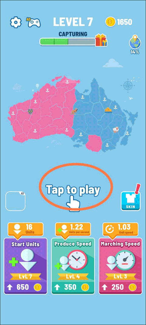 进入游戏后点击我们可以看见有一个很大的地图,屏幕中间有着一句话“tap to play”,点他就游戏开始了,它下面的3个分别是你的部队生成时间速度和数量,后续可以通过用金币升级的渠道加强这三项能力。