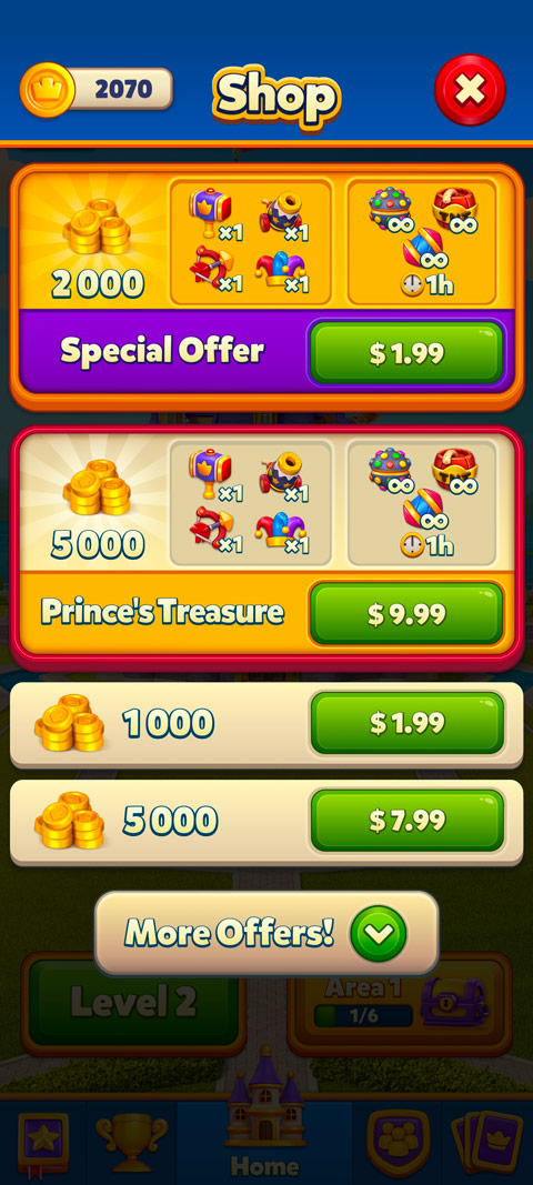 皇家比赛官方正版是一款全新的休闲消除手游,英文叫作:Royal Match,该游戏采用Q版卡通画风绘制,玩家在这里将通过三消玩法进行闯关,闯关成功后还可获得解锁新区域的金币,以此装饰和升级罗伯特国王的城堡。而在玩法上,游戏则以竖屏点击操作的闯关玩法为主,玩家需要将三个相同颜色的方块放在同一列即可完成消除,而且游戏上方会显示通关要求,玩家需根据要求消灭相应的方块。