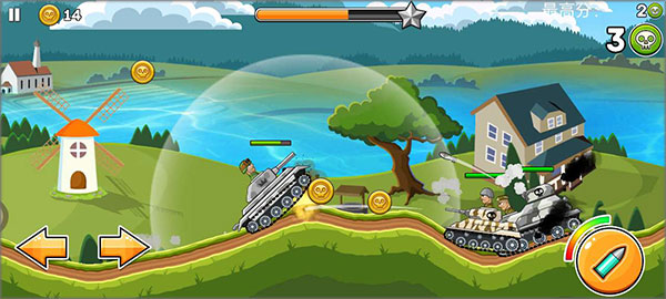 此外游戏中提供了各种各样的场景,玩家可以不断解锁新的场景,在各种场景下的山坡上与敌人进行对战,真实模拟军事战争,冲锋陷阵消灭敌人。 游戏难度会随着你不断的挑战,你会遇到无数的敌人,有地上的坦克,同时还有天上的飞机。不过不用怕,游戏提供了很多有利的条件,方便玩家游戏,山坡的角度,防护罩等等。刺激又具有挑战性,快来试试,看看谁可以站到最后。