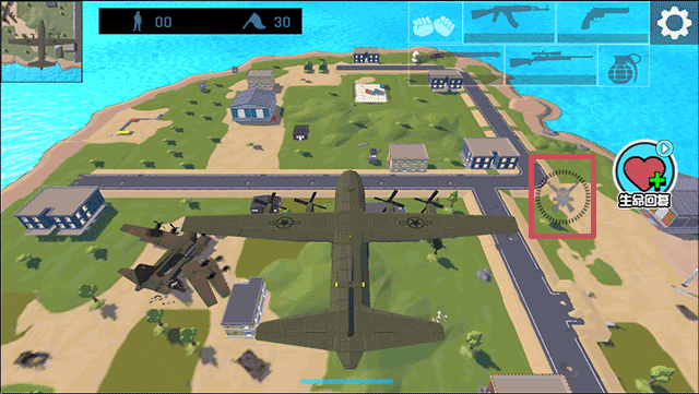 3、现在就跟随飞机来到战场吧,点击右边的红色方框内的功能选项进行跳伞;