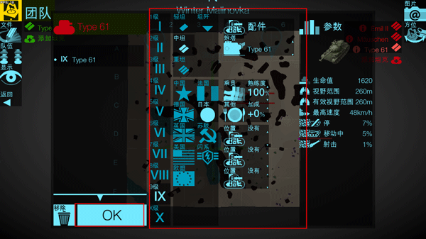 坦克就是给地图中的两个队伍添加不同类型的坦克装备,如轻坦、中坦等,还能选择炮塔的型号,设置乘员的熟练度等参数,全部都设置好后点击“OK”。