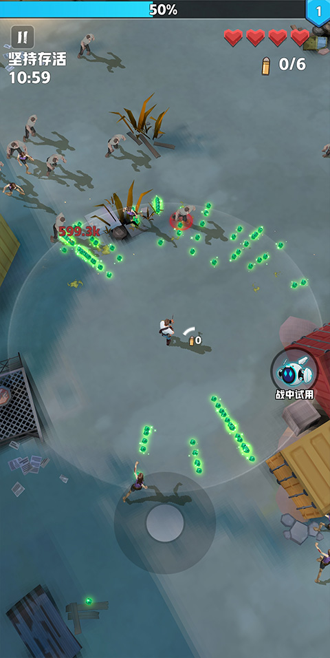 3、升级好武器之后就可以进入战斗了,进入游戏之后滑动屏幕控制游戏角色,控制角色来躲避僵尸的攻击;