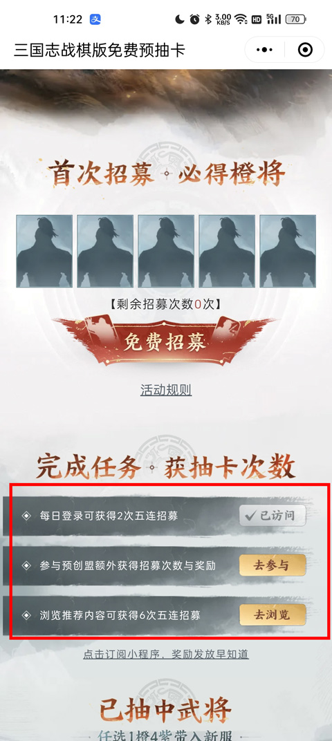 4、当玩家完成任务之后,就直接点击上方的“免费招募”,就可以获取相应的阵容了。