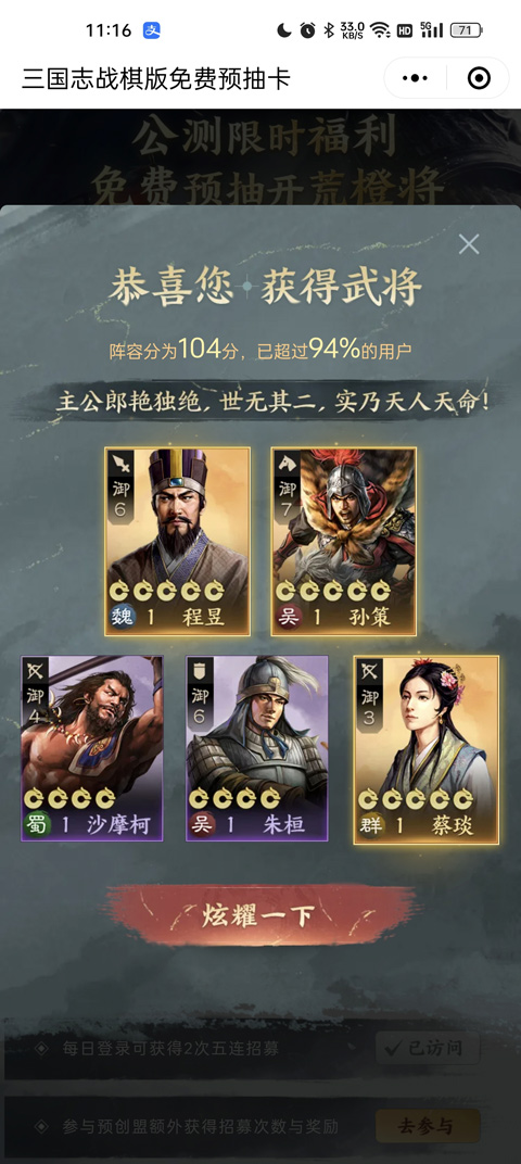 签到第二天会赠送曹仁,所以盾兵是不缺的,但是朱恒的战法是启动战法,可以援护突入敌方的队友,还有加了大量的统率,上场和拆分都是不错的。