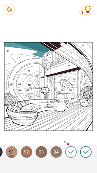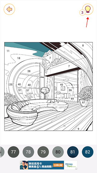 4、如果实在找不到未填完的色块,除了把图形放大进行寻找之外,还可以点击右上角的灯泡图标,进行提示