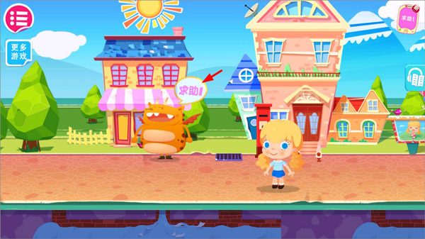 1、打开修理小达人糖糖游戏,迎来糖糖小镇明媚的一天,小超人糖糖要开始工作啦!先看看都有谁需要帮助吧~玩家可以通过点击小伙伴们头顶的“求助”,或屏幕上方的箭头图标进入小游戏哦;