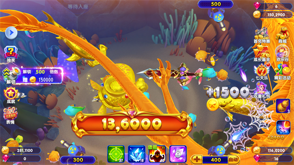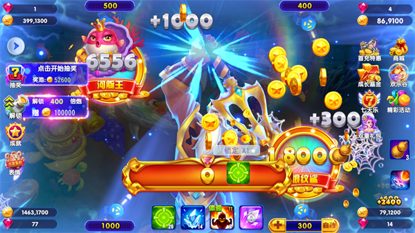 1、使用方法:点击召唤可以在游戏中召唤一条强力的奖金鱼,同时,每当我们击杀奖金鱼后,会在奖金池内积揽一笔金额,击杀的奖金鱼越多,奖池的金额也就越多,等级也就越高,我们可以享受到不用等级的抽奖活动,有可能抽中红包或者钻石、金币等奖品。