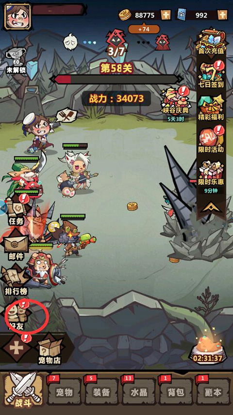 5、按照上述步骤操作就可以轻松提升整体战斗力了,升级和强化用到的材料和道具我们可以通过关卡以及副本挑战获取