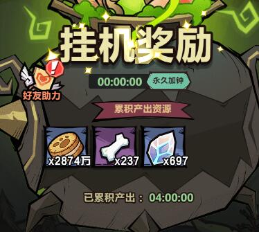 初始挂机是四小时,日常挂机也能获得大量的资源奖励,可自动贮存资源,挂机也能获得丰厚奖励