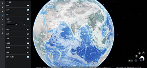 星图地球支持星空、大气、雾、光照、帧率、海洋、云层、云层速率、地形、夸张类型等多种地球环境特效设置,可以为用户创造直观逼真的三维可视化场景。