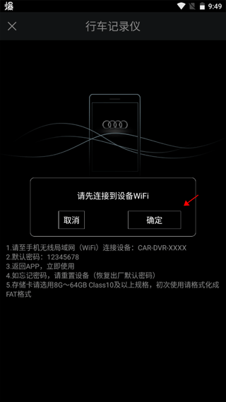 4、WiFi连接成功后就可以按照下方文字的引导来连接行车记录仪了,连接成功后就可以开始操作了。
