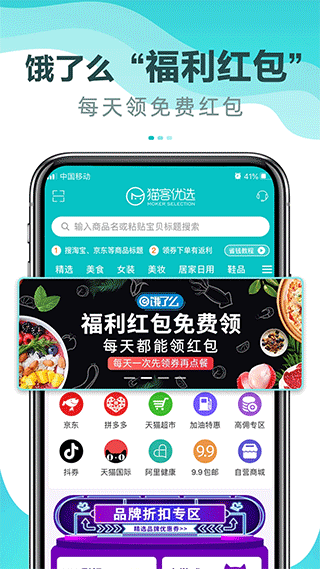 1、打开猫客优选app,首页可领取各大购物平台优惠券,领券后再下单优惠力度更大;