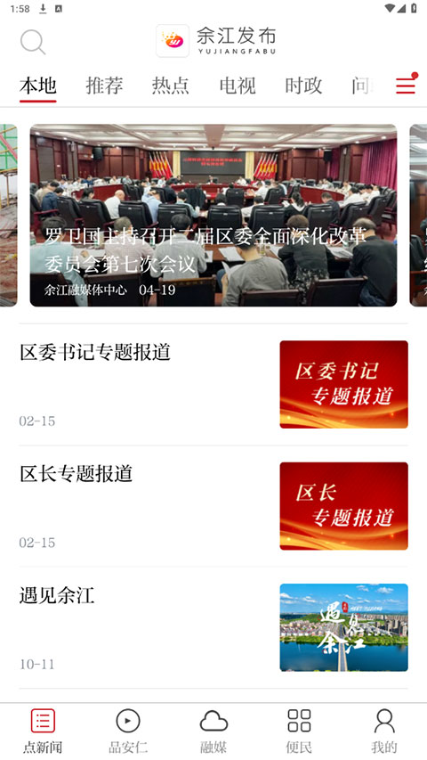 软件功能完善,为用户提供有各类时政新闻和党报党刊,各位市民朋友们还可以在这里畅所欲言,发布自己的看法和建议。为了让更多人了解到余江的魅力,余江发布客户端还设计有本地的各种新闻报道,这些新闻的展示可以让很多人及时了解余江区的实时情况,针对很多人说的线下办事难的问题,软件也为广大办事群众提供有齐全的便民服务,可以很好的缓解线下排队严重的问题,大家有需要就快来下载使用吧!