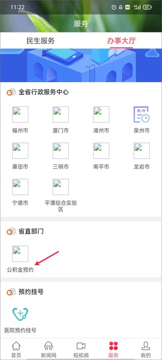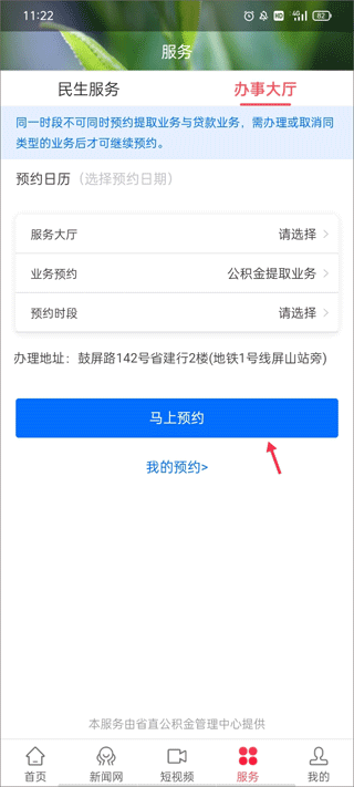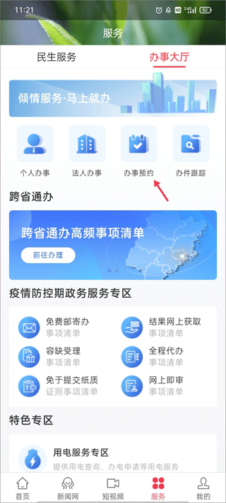 1、选择软件的【服务】模块,点击办事大厅区域的“办事预约”。