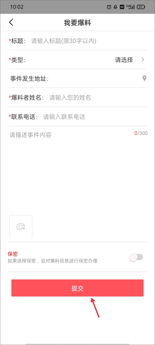 3、输入标题,类型以及爆料者的相关信息,填写爆料内容之后,点击提交按钮。