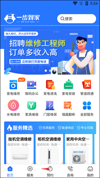 1、进入一步到家家庭维修app点击底部的预约