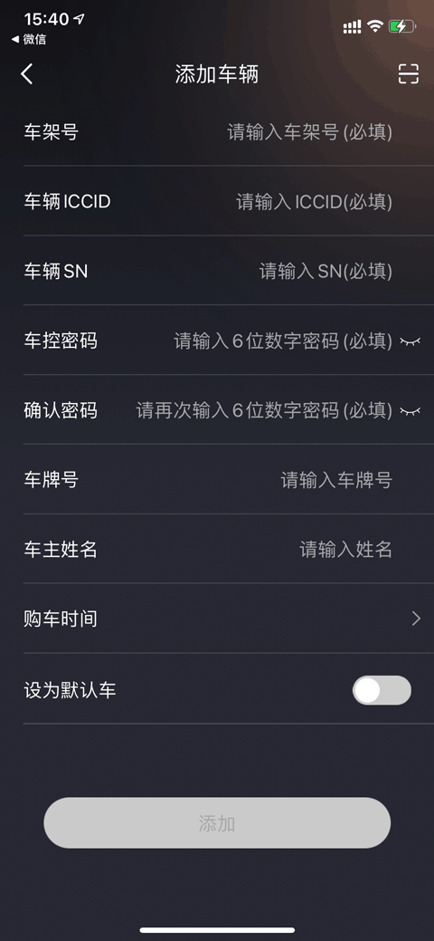 3、注册完成后,点击“车辆体验”或者下方的“绑定”,输入车辆的车架号、车辆iccid、车辆SN等详细信息进行添加。