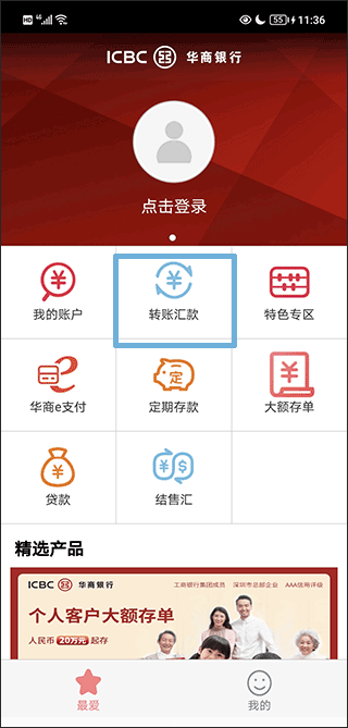 1、首先,打开软件,在“最爱”界面找到并点击“转账汇款”按键;