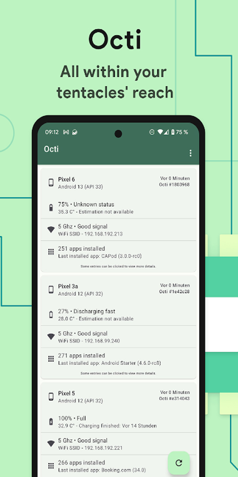现在不少人手里都会有多个手机,可以更好的区分工作和生活,但大多数人会将主力机放到口袋中,其他设备就放到包里,如果其中一个手机没电关机了,我们也很难察觉到。那么有没有什么工具能在一处就监控到设备的基本运行状态呢?今天小编为大家带来了octi app,这是一款备用手机信息同步查看软件,由SD Maid和 Permission Pilot 的作者darken开发的,能够把你所有设备信息交织在一起,只需要查看其中任意一个设备,其他设备的系统信息、电池状态、网络状态、已安装应用以及剪贴板内容就能一目了然,有需要的小伙伴们可以来本站下载使用。