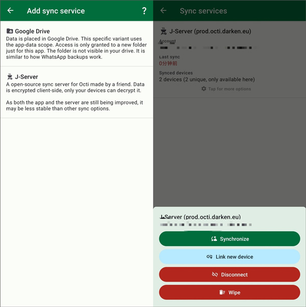 J-Server 是由另一位开发者 @jakmoe 提供的开源同步服务,Octi 同步服务器由 darken 托管,传输过程使用了端到端加密,并且采用匿名注册方式,有能力的用户也可以自行托管该类型服务器