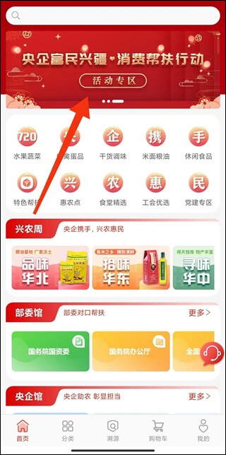 1、进入“央企消费帮扶”页面后,点击首页轮播图,直达活动区