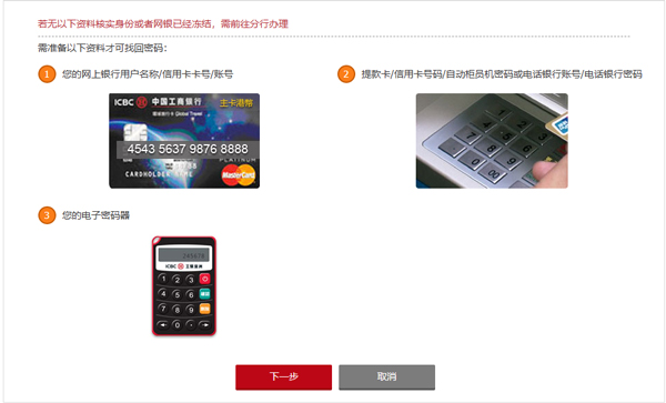 若无以上资料核实身份或者网银已经冻结,需前往分行办理