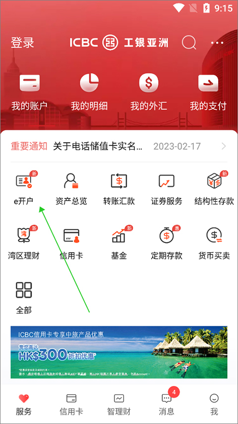 开户可前往工银亚洲手机银行【服务】页面下点击【e开户】