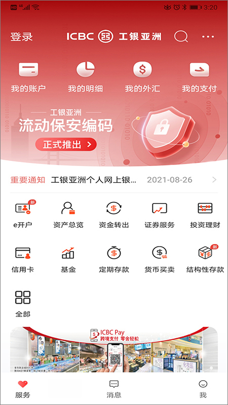 同时工行亚洲银行手机银行app拥有多元化的理财产品,包括存款、贷款、信用卡、证券、基金、保险、贵金属、活期宝、货币买卖等领域的投资服务,并凭借中国工商银行在内地的强大优势,更备有不同种类的人民币产品及跨境服务,令您尽享两地理财的便利。除此之外,工银亚洲在货币买卖方面可兑换包括:英镑、人民币、欧元、澳元、加拿大元、日元、新加坡币、纽西兰币、瑞士法郎及美元等热门货币。