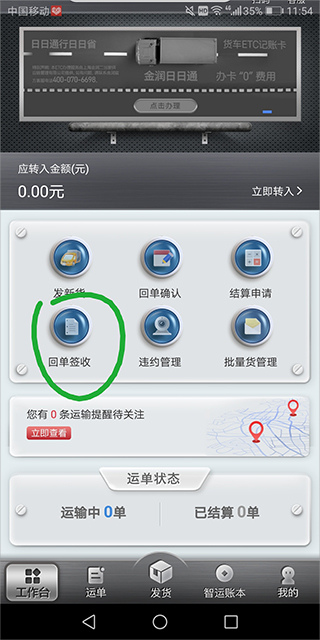 1、打开并以会员方式登入中储智运货主app,进入工作台点击“回单签收”