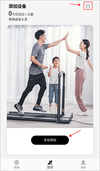 1、打开软件后,在运动界面点击手动添加或右上角的扫描框扫码添加。