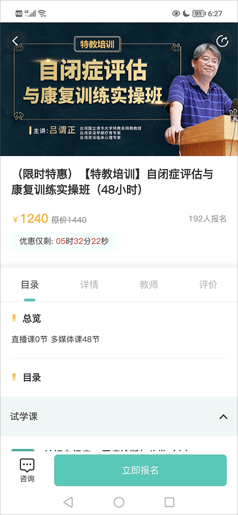 3、接着,在看清楚目录、详情、教师和评价后就可以点击立即报名或者咨询了。