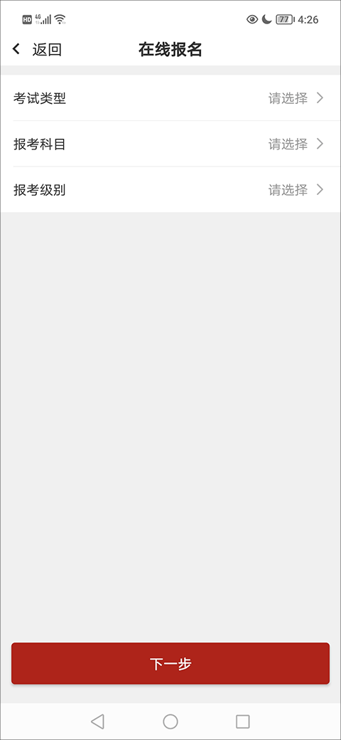3、接着,在在线报名中选择好考试类型、包括科目和报考级别后,点击下一步;
