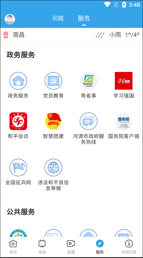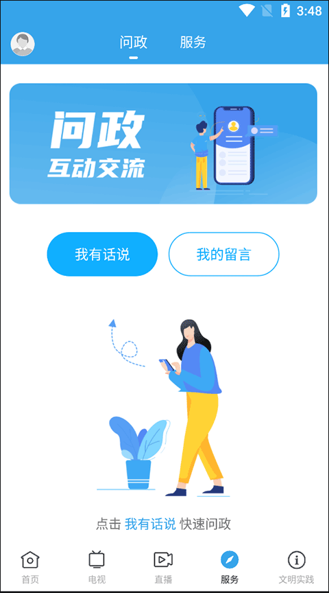 1、首先,打开软件,在服务当中找到并点击“问政”按键;