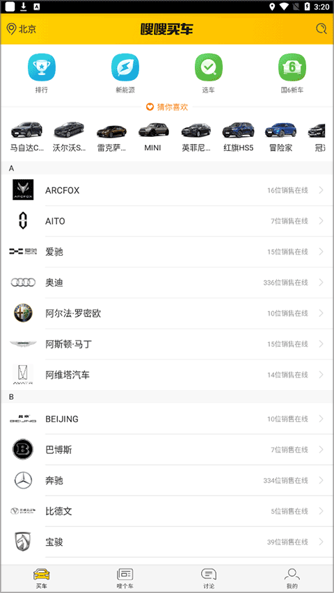 1、下载安装好嗖嗖买车官方版,进入软件,你可以查看到许多种的品牌的车子。