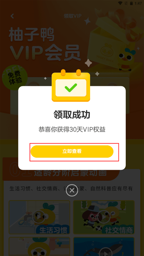 打开app,这时软件主界面【首页】会自动弹出让你免费领取30天VIP权益的广告,点击领取之后需要等待一会儿,页面跳转到领取VIP界面上,显示领取成功的提示。