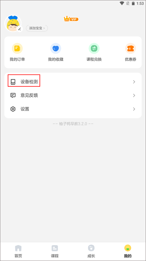 (1)选择下方菜单栏【我的】界面,你会看到我的订单、我的收藏、课程兑换、优惠券、设备检测等功能,点击“设备检测”。