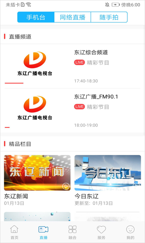 1、用户打开e东辽app后,切换底部导航栏至【直播】处(下图绿色箭头所指区)